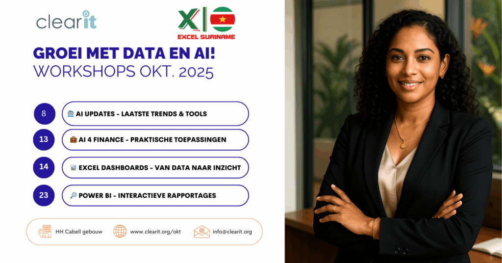 In oktober nodigen Clear IT Solutions en Excel Suriname je uit voor vier praktijkgerichte workshops waarin AI en datagedreven werken centraal staan. Elke sessie biedt actuele inzichten, hands-on oefeningen en voorbeelden die direct toepasbaar zijn in je dagelijkse werk. Programma: Datum Tijd Workshop […]